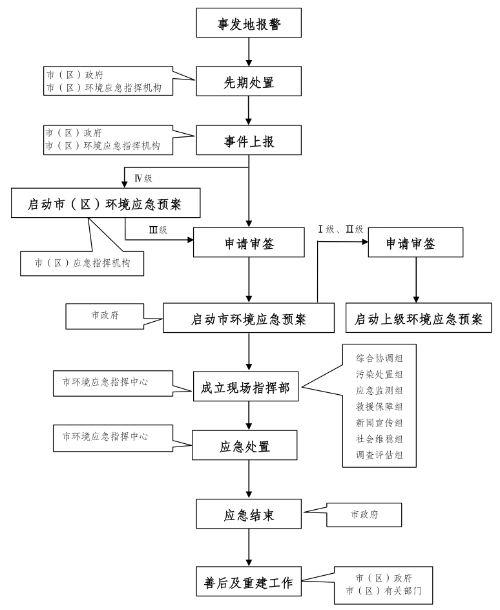 發生較大以上突發環境事件時,市突發環境事件應急指揮中心根據應急處置工作需要,成立環境應急現場指揮部,負責事故現場的應急指揮工作。對重大以上突發環境事件,現場指揮權移交省級以上有關部門。