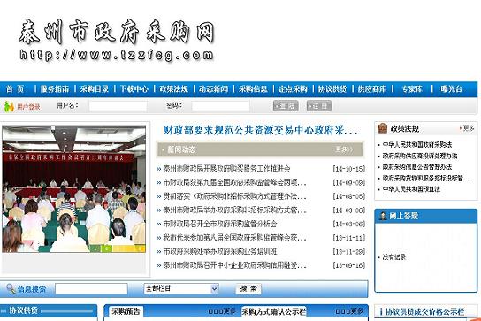 ??? 9、加強(qiáng)政府采購(gòu)信息公開(kāi)。建立運(yùn)行“泰州市政府采購(gòu)網(wǎng)”,具有服務(wù)指南、下載中心、政策法規(guī)、采購(gòu)信息、采購(gòu)新聞、網(wǎng)上競(jìng)價(jià)、定點(diǎn)采購(gòu)、公示曝光等各種功能,為政府采購(gòu)當(dāng)事人提供“公開(kāi)、公平、公正、高效”的采購(gòu)平臺(tái)。2014年,“政府采購(gòu)網(wǎng)”共發(fā)布公開(kāi)招標(biāo)公告141條,競(jìng)爭(zhēng)性談判公告50條,詢(xún)價(jià)采購(gòu)公告153條,單一來(lái)源公告13條,中標(biāo)公示280條,廢標(biāo)公示41條。