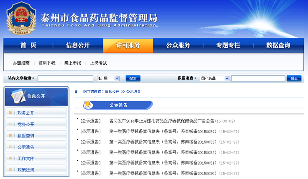??? 18、深入推進(jìn)食品藥品安全信息公開(kāi)。做好食品藥品監(jiān)管法律法規(guī)及規(guī)范性文件的解讀,2014年共解讀《醫(yī)療器械監(jiān)督管理?xiàng)l例》、新修訂的《藥品經(jīng)營(yíng)質(zhì)量管理規(guī)范》等法規(guī)規(guī)章2次,發(fā)布解讀性文稿7篇。主動(dòng)公開(kāi)食品藥品安全日常監(jiān)管、許可審批、行政處罰等常規(guī)信息,積極回應(yīng)社會(huì)關(guān)注的熱點(diǎn)問(wèn)題。加大食品藥品專(zhuān)項(xiàng)整治活動(dòng)信息的公開(kāi)力度,對(duì)省食藥監(jiān)局統(tǒng)一組織的網(wǎng)上非法售藥、醫(yī)療器械“五整治”等專(zhuān)項(xiàng)行動(dòng),從整治方案到階段成效、活動(dòng)總結(jié)、典型案件查處情況進(jìn)行全面公開(kāi)。通過(guò)報(bào)紙、泰州市局門(mén)戶(hù)網(wǎng)站、泰州發(fā)布和泰州市食藥監(jiān)政務(wù)微博等多途徑,對(duì)獲國(guó)家食藥監(jiān)總局掛牌督辦的“1?6”系列利用互聯(lián)網(wǎng)制售假藥案和“6.10”孔某等非法生產(chǎn)角膜接觸鏡案兩起大要案進(jìn)行重點(diǎn)宣傳,營(yíng)造打假治劣的高壓態(tài)勢(shì)。