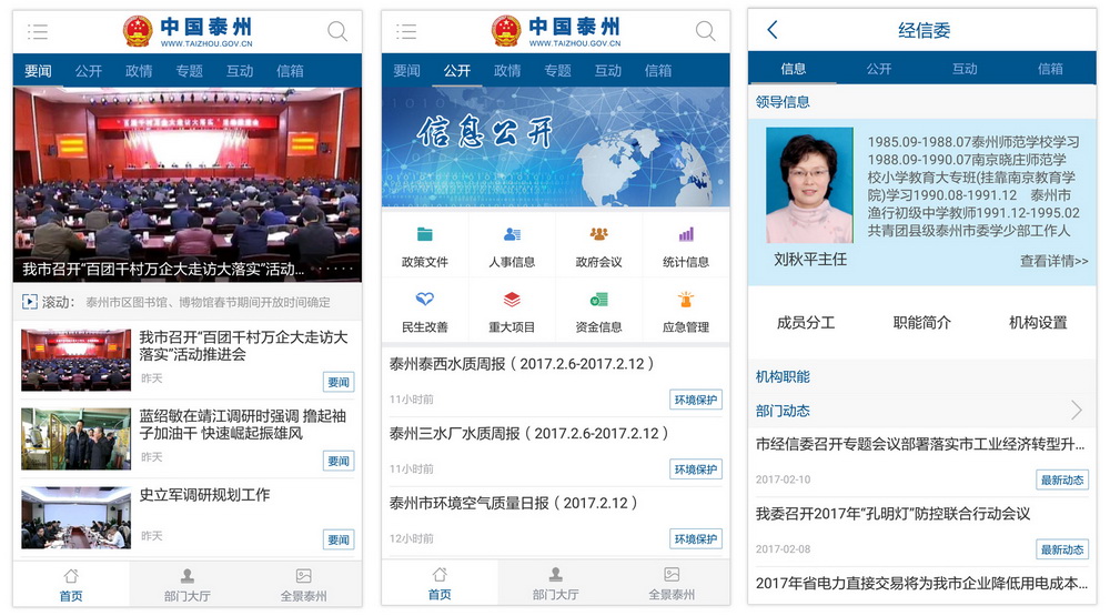 2.打造集約化程度高的“中國·泰州”微門戶平臺。整合全市82家政府職能部門網站,建成“中國·泰州”政府門戶網站群,實現全市各部門網站信息和服務資源的充分共享。依托政府門戶網站群,建成“中國?泰州”微門戶,匯集要聞、公開、政情、專題、部門、信箱等頻道,實現政府門戶網站移動化,滿足群眾在智能終端上查閱政府信息、獲取服務資訊、參與互動交流等需求。推進統一規范的部門微門戶平臺建設,整合部門相關資源,全維度公開部門信息。