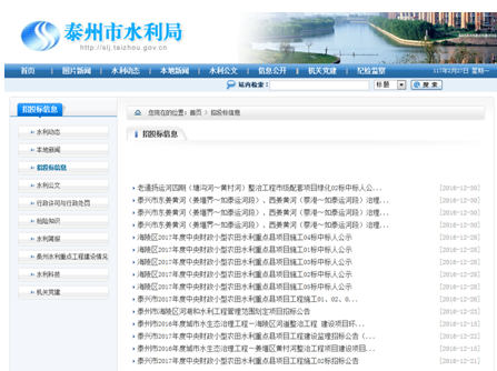 ??? (三)推進公共資源配置信息公開。建立水利工程招投標信息系統,實行電子招標投標,相關信息均在泰州市水利局門戶網站“招投標”專欄公開,按有關規定,對達到招標限額的采購項目,采購過程和結果及時上網公開。2016年公開招投標信息200余條。
