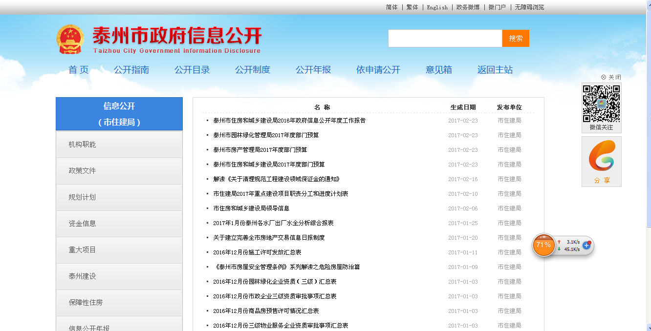 ?泰州市住房和城鄉建設局2016年政府信息公開年度工作報告