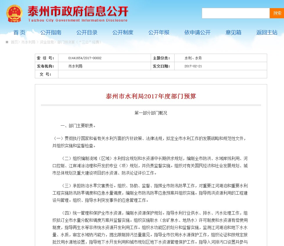 本局2017年政府信息公開工作運行正常,政府信息公開咨詢、申請以及答復工作均得到了順利開展。政府信息主動公開工作的內容方面,我局2017年度共主動公開政府信息56條。包括機構職能、政策文件、規劃計劃、統計數據、資金信息、民生公益、人事信息等。行政權力公開共公布各項行政權力及流程圖。政府信息主動公開的渠道方面,為方便公眾了解信息,我局在泰州水利網、泰州政府網站上均設立“政府信息公開”專欄,公布《目錄》、《指南》和信息內容,并接受搜索和下載;設立“信息公開動態” 欄目,及時公布我局最新的工作動態