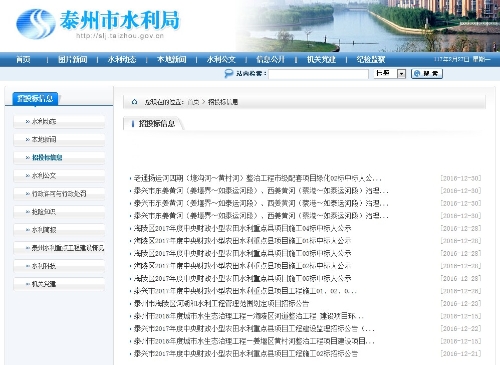 (三)推進公共資源配置信息公開。建立水利工程招投標信息系統,實行電子招標投標,相關信息均在泰州市水利局門戶網站“招投標”專欄公開,按有關規定,對達到招標限額的采購項目,采購過程和結果及時上網公開。2017年公開招投標信息200余條。