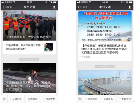 四是新聞媒體。充分利用報紙、電視、新浪微博、騰訊微博、泰州交通服務公眾號等渠道發布信息,開辟公交、春運等政務專題,及時更新公交長運、鐵路航班等旅客運輸信息,及時開通便民查詢、便民問答。局主要領導、分管領導積極參加“行風熱線”、“在線訪談”、“在線直播”等活動。下圖為“泰州交通”微信公眾號及時發布各類交通信息。