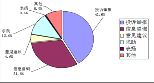 三是網絡熱點輿情回復。積極回應公眾關注的熱點問題,全年共處理并回復《市長信箱》209件,“12345政府服務熱線”1523件, 96196服務熱線受理各類電話15235次,平均月接通率98%,滿意率98.4%,按時辦結率99%,提供在線咨詢、政策宣傳、投訴解答等,成為交通部門服務社會的有效載體和信息公開的重要窗口。下圖為2017年96196話務類型占比分布圖。