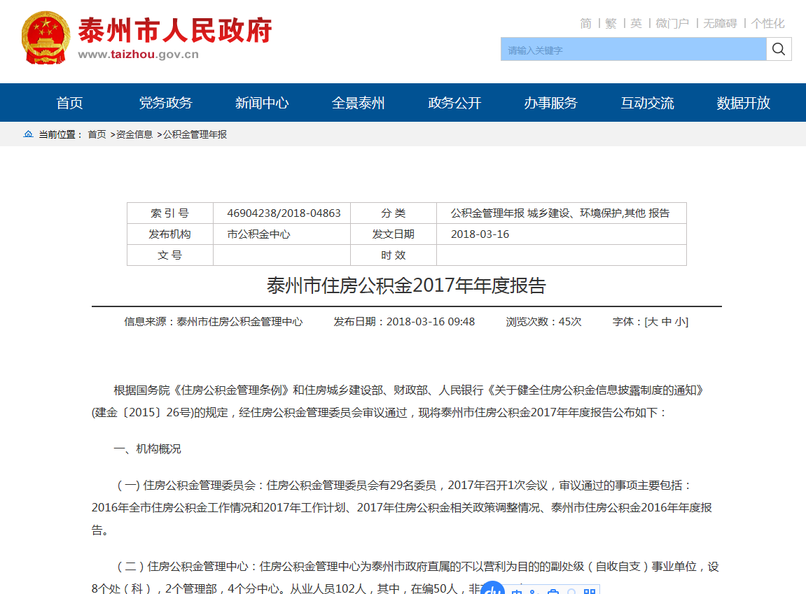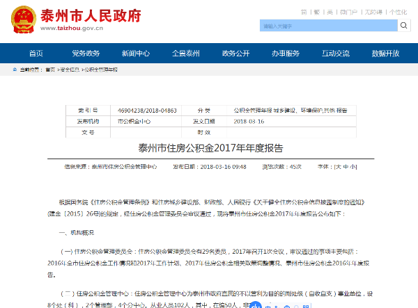 ? ? ? ? 嚴(yán)格按照住建部、財(cái)政部和人民銀行《通知》和《住房公積金信息披露指引》要求以及規(guī)定模板編制《泰州市住房公積金2017年年度報(bào)告》,并于2018年3月中旬在政府門(mén)戶網(wǎng)站、中心網(wǎng)站、泰州日?qǐng)?bào)進(jìn)行全文披露。年度報(bào)告做到應(yīng)披盡披,不僅披露中心本部的數(shù)據(jù),還及時(shí)披露分中心(管理部)的業(yè)務(wù)數(shù)據(jù);不僅披露個(gè)貸業(yè)務(wù)情況,還及時(shí)披露風(fēng)險(xiǎn)資產(chǎn)狀況;不僅披露業(yè)務(wù)收入情況,還同時(shí)披露中心管理費(fèi)用支出情況,真正做到信息準(zhǔn)確、公開(kāi)及時(shí)。